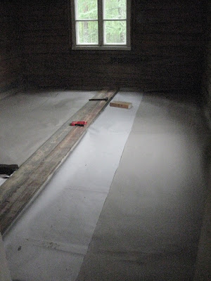 Tässä siis villan päälle laitettu suojapaperi ja siihen sitten asennettiin lattialankut pontteihinsa. Lankut on M:n äidin vanhasta kototalosta. Niistä hiottiin vaaleanpunaviolettinen maali pois ja jätettiin vielä puupinnalle. Kierrätystä kierrätystä! :) Samoja lankkuja käytettiin myös kuistin lattiassa, joten lankut tuli todella tarpeeseen.